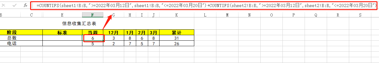 如上图,有多个sheet,其中数据在sheet1和sheet2中,要求统计12月,1月,2月,3月合计数有多少条记录,并统计带电话信息的有多少个(部分电话列空的要剔除统计的意思)。另外要统计本周(涉及日期范围)的总数和带电话信息的数据。